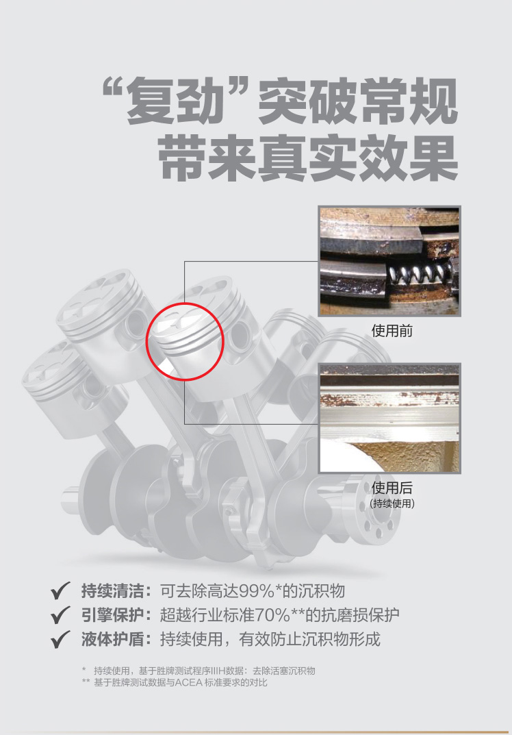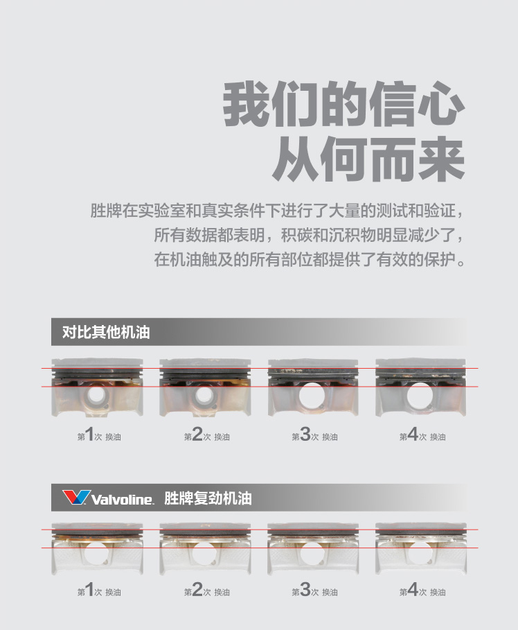 胜牌在实验室和真实条件下进行了大量的测试和验证,所有数据都表明,积碳和沉积物明显减少了,在机油触及的所有部位都提供了有效的保护。